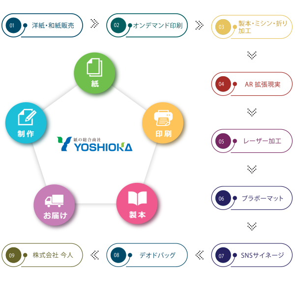 株式会社 吉岡は、紙の卸販売はもちろんのこと、製作(DTP)からオンデマンド印刷、ミシン加工、製本、配送まで ワンストップでサービスの提供が可能です。