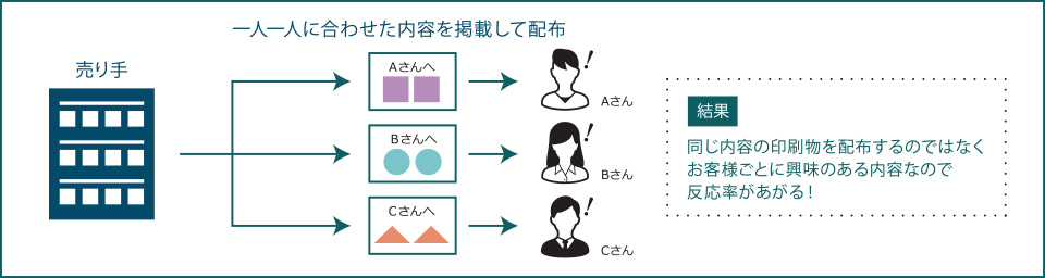 バリアブル印刷は様々なシーンで活用できるOneToOne印刷です。1部ずつ文字や画像を変えて印刷することができます。対象を特定せず市場全体へ単一的な広告を展開するマスマーケティングから、多様化したニーズに合わせて広告を展開するエリア・セグメントマーケティング。